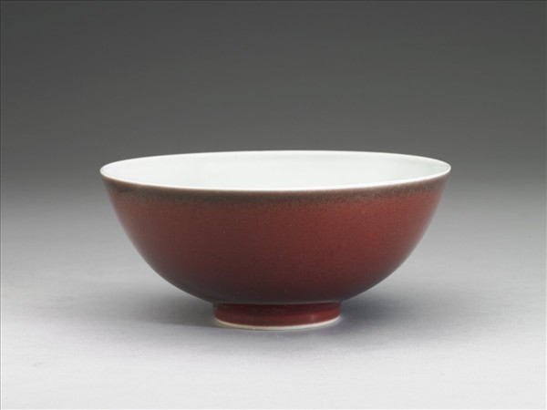侈口大碗,侈口,深壁,平底,圈足。外壁施銅紅釉,呈暗紅色,釉色不均,器表各處有深色苔點,器內及外底施透明釉,圈足底端露胎呈白色,底以青花書「大清雍正年製」六字雙行楷款,外加雙圈。