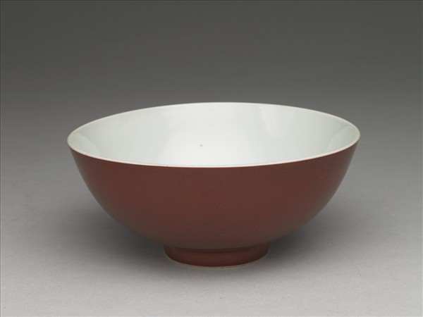 侈口大碗,侈口,深壁,平底,圈足。外壁施銅紅釉,呈暗紅色,釉色均勻,器內及外底施透明釉,圈足底端露胎呈淡褐色,底以青花書「大清雍正年製」六字雙行楷款,外加雙圈。