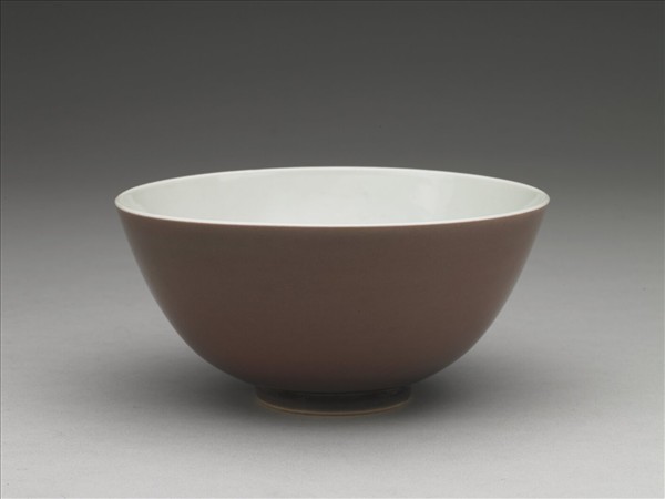 侈口大碗,侈口,深壁,平底,圈足。外壁施銅紅釉,呈灰暗紅色,釉色均勻,積釉處顏色較深,器內及外底施透明釉,圈足底端露胎呈白色,底以青花書「大清雍正年製」六字雙行楷款,外加雙圈。