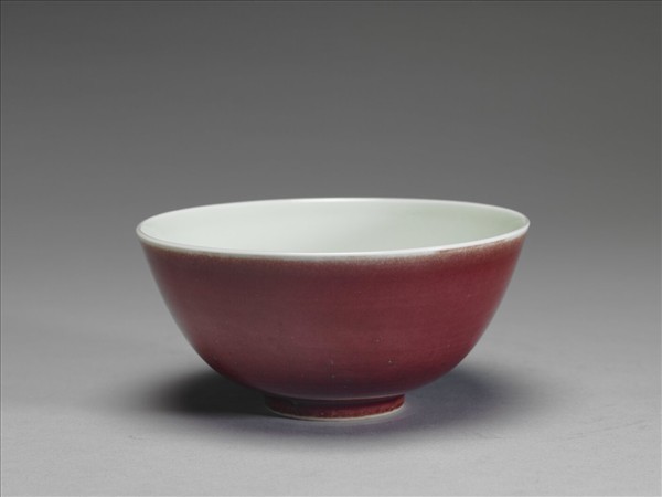 侈口大碗,侈口,深壁,平底,圈足。外壁施銅紅釉,呈紅色,口緣處因流釉有白色苔點,器表有深色或淺色苔點,器內及外底施透明釉,器表有棕眼,圈足底端露胎呈白色,底以青花書「大清雍正年製」六字雙行楷款,外加雙圈。