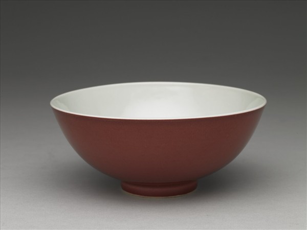 侈口大碗,侈口,深壁,平底,圈足。外壁施銅紅釉,呈深紅色,釉色均勻,器內及外底施透明釉,圈足底端露胎呈白色,底以青花書「大清雍正年製」六字雙行楷款,外加雙圈。