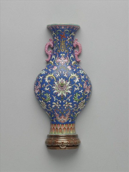 全器如縱剖的半器,呈半面雙螭耳瓶形。背為平面,有孔可穿繫固定於牆面或轎子之內,故稱之為壁瓶或轎瓶。此瓶撇口,短頸,有螭耳一對。斜肩,碩腹下斂,平底,下接一底座。通體罩施粉藍釉為地,彩繪各式洋彩圖案。口沿飾如意雲頭紋,頸部飾「卍」字、「壽」字與一蝙蝠銜雙桃。腹部繪一組纏枝蓮紋,下接一蝙蝠,左右亦各飾一蝙蝠。四周飾轉枝花卉紋,底邊繪蓮瓣紋。底座施褐色釉為地,繪連珠紋及如意雲紋等。背平施粉藍釉,有一方凹槽和四小圓,穿帶繫孔可作懸掛固定用。器底施褐釉,以金彩書「乾隆年製」單行橫向篆款。