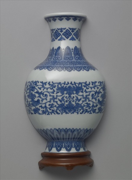 全器如縱剖的半器,呈半面瓶形,背為平面,有孔可穿繫固定於牆面或轎子之內,故稱之為壁瓶或轎瓶。此瓶侈口,短頸,斜肩,碩腹下斂,撇足,下接一底座。器身白地,飾青花紋樣。口緣飾如意雲頭紋一周,頸部飾蝙蝠、卍字與磬組成的帶狀紋和蕉葉紋。肩部飾三角紋和如意雲紋,腹部飾蝙蝠、卍字與纏枝花卉組成的帶狀紋,底邊飾蓮瓣紋,足部飾如意雲紋。底座施褐釉。背平留白,周圍飾鈷藍梅點;有一方凹槽和四小圓穿帶繫孔可作懸掛固定用。器底施褐釉,以金彩書「大清乾隆年製」單行橫向篆款。