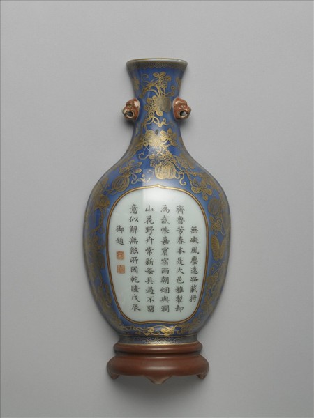 全器如縱剖的半器,呈半面雙獸耳瓶形,背為平面,有孔可穿繫固定於牆面或轎子之內,故稱之為壁瓶或轎瓶。此瓶侈口,直頸,斜肩。碩腹下斂,撇足,下接一底座。通體罩施霽青釉,以金彩描繪紋樣。口緣飾如意雲紋一周,瓶身繪纏枝瓜藤及花果、蝴蝶。腹部中央開光留白,墨書「無礙風塵遠路,載將齊魯芳春。本是大邑雅製,卻為武帳嘉賓。宿雨朝煙與潤,山花野卉常新。每具過不留意,似解無能所因。乾隆戊辰(十三年,1748)御題」、印「乾」(乾卦)、「隆」。底座施褐釉。背平施霽青釉,周圍飾梅花點紋;有一方凹槽和四小圓穿帶繫孔可作懸掛固定用。器底施褐釉,以金彩書「大清乾隆年製」單行橫向篆款。