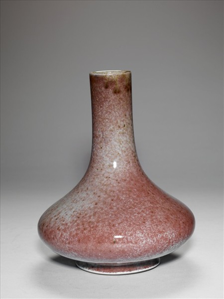 直口,直長頸,垂腹,圈足。全器施銅紅釉,佈滿白色、暗紅色苔點。足底露胎,塗赭色護胎汁。器底施醬釉,底心印有「雍正年製」六字三行篆書款。