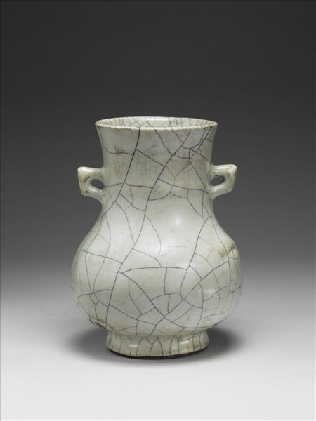 撇口,直頸,雙方形環耳,圓腹,圈足。全器施哥釉,釉面佈滿深色開片紋。足底露胎,塗鐵黑色護胎汁。