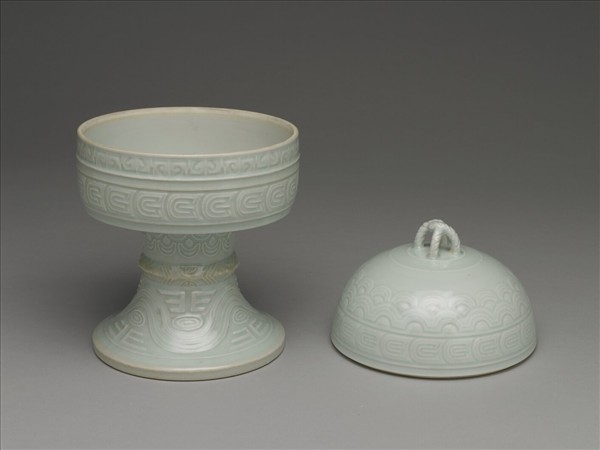 器仿故銅器之豆形,帶蓋子母口,綯鈕穹頂蓋。深直壁略外弧,平底,高足外撇。整器罩施白釉,釉色白中泛青,其積釉處呈較深的水青色。全器外表模印仿古之幾何紋飾,依《皇朝禮器圖式》,為乾隆十三年(1748)禮器的式樣,描述所用紋飾為當時的名稱:器身腹部為垂雲紋、回紋;高足的上部為波紋,中段為金鈑紋,下段為黻紋。蓋的紋飾為波紋、回紋。蓋內與足內均刻「大清乾隆年製」三行六字款。此器為清代乾隆朝所製之祭器:「豆」,器樣見載於《皇朝禮器圖式》卷一。不同祭祀,用不同釉色。此器釉色白中泛青,係用於祭夕月壇的月白色釉豆。