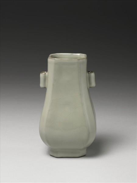 仿銅壺式,長方形,四角削邊,呈八邊形;斜肩,垂腹,八邊形圈足,斜肩貼飾一對方形貫耳。仿銅器貫耳壺造型,口足做方形,四角削邊,呈八面造型;斜肩,垂腹。斜肩貼飾一對貫耳。全器施仿官青釉,呈灰青色,釉色均勻溫潤,釉面有細密淺色開片紋,口緣及貫耳上緣因流釉而呈淡褐色。圈足底緣塗護胎汁,呈黑褐色。底以青花書「大清乾隆年製」六字三行篆款。