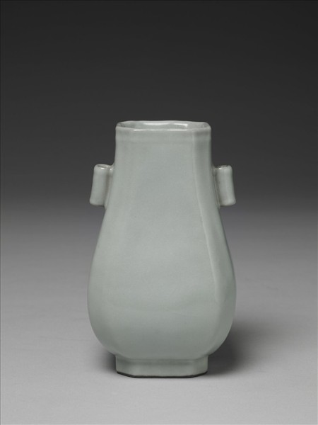 仿銅器貫耳壺造型,口足做方形,四角削邊,呈八面造型;斜肩,垂腹。斜肩貼飾一對貫耳。全器施仿官青釉,釉色均勻溫潤,釉面有淺色開片紋。圈足底緣塗護胎汁,呈黑褐色。底以青花書「大清乾隆年製」六字三行篆款。
