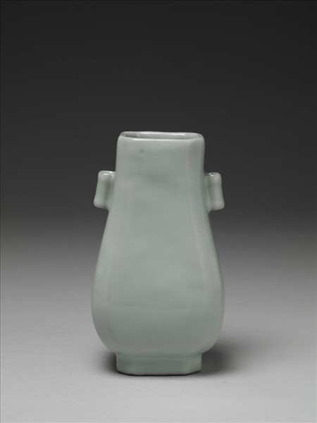 仿銅器貫耳壺造型,口足做方形,四角削邊,呈八面造型;斜肩,垂腹。斜肩貼飾一對貫耳。全器施仿官青釉,釉色均勻溫潤,釉面有縮釉孔。圈足底緣塗護胎汁,呈黑褐色。底以青花書「大清乾隆年製」六字三行篆款。