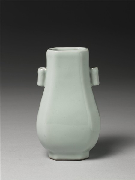 仿銅器貫耳壺造型,口足做方形,四角削邊,呈八面造型;斜肩,垂腹。斜肩貼飾一對貫耳。全器施仿官青釉,釉色均勻溫潤,口緣及貫耳上緣因流釉而呈淡褐色。圈足底緣塗護胎汁,呈黑褐色。底以青花書「大清乾隆年製」六字三行篆款。