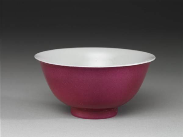 撇口,深弧壁,矮圈足。外壁施胭脂紅釉,器內及足內施白釉,內壁白釉下印飾雙雲龍紋。器壁勻薄、透光,器內白釉凝如羊脂白玉,胭脂紅釉色近紫紅。底青花書「雍正年製」四字二行楷款,外加雙方框。 胭脂紅釉色如女子絳唇胭脂之色故名,又稱玫瑰紅、薔薇紅、洋紅等,康熙年間由西洋傳入,以微量黃金做為呈色劑,二次低溫焙烤所得。