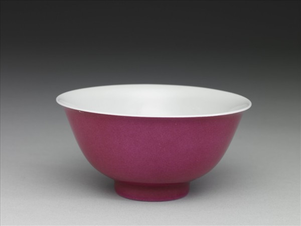 撇口,深弧壁,矮圈足。外壁施胭脂紅釉,器內及足內施白釉,內壁白釉下印飾雙雲龍紋。器壁勻薄、透光,器內白釉凝如羊脂白玉,胭脂紅釉色近紫紅。底青花書「雍正年製」四字二行楷款,外加雙方框。 胭脂紅釉色如女子絳唇胭脂之色故名,又稱玫瑰紅、薔薇紅、洋紅等,康熙年間由西洋傳入,以微量黃金做為呈色劑,二次低溫焙烤所得。