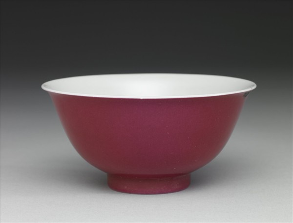 撇口,深弧壁,矮圈足。外壁施胭脂紅釉,器內及足內施白釉,內壁白釉下印飾雙雲龍紋。器壁勻薄、透光,器內白釉凝如羊脂白玉,胭脂紅釉色近紫紅。底青花書「雍正年製」四字二行楷款,外加雙方框。 胭脂紅釉色如女子絳唇胭脂之色故名,又稱玫瑰紅、薔薇紅、洋紅等,康熙年間由西洋傳入,以微量黃金做為呈色劑,二次低溫焙烤所得。