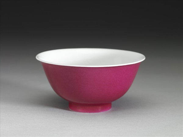 撇口,深弧壁,矮圈足。外壁施胭脂紅釉,器內及足內施白釉,內壁白釉下印飾雙雲龍紋。器壁勻薄、透光,器內白釉凝如羊脂白玉,胭脂紅釉色近紫紅。底青花書「雍正年製」四字二行楷款,外加雙方框。 胭脂紅釉色如女子絳唇胭脂之色故名,又稱玫瑰紅、薔薇紅、洋紅等,康熙年間由西洋傳入,以微量黃金做為呈色劑,二次低溫焙烤所得。