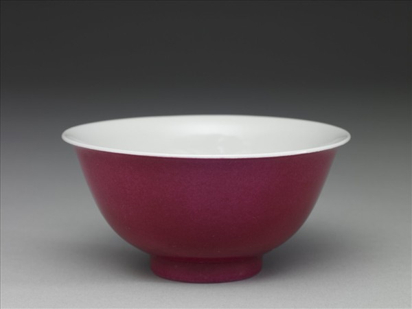 撇口,深弧壁,矮圈足。外壁施胭脂紅釉,器內及足內施白釉,內壁白釉下印飾雙雲龍紋。器壁勻薄、透光,器內白釉凝如羊脂白玉,胭脂紅釉色近紫紅。底青花書「雍正年製」四字二行楷款,外加雙方框。 胭脂紅釉色如女子絳唇胭脂之色故名,又稱玫瑰紅、薔薇紅、洋紅等,康熙年間由西洋傳入,以微量黃金做為呈色劑,二次低溫焙烤所得。