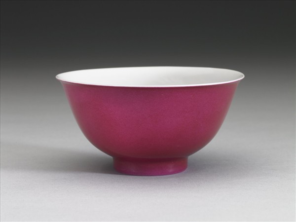 撇口,深弧壁,矮圈足。外壁施胭脂紅釉,器內及足內施白釉,內壁白釉下印飾雙雲龍紋。器壁勻薄、透光,器內白釉凝如羊脂白玉,胭脂紅釉色近紫紅。底青花書「雍正年製」四字二行楷款,外加雙方框。 胭脂紅釉色如女子絳唇胭脂之色故名,又稱玫瑰紅、薔薇紅、洋紅等,康熙年間由西洋傳入,以微量黃金做為呈色劑,二次低溫焙烤所得。