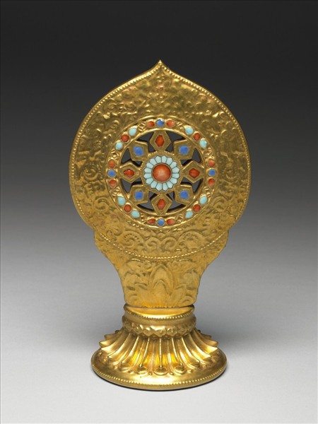 造形模仿金嵌寶石的法輪供具,以瓷土塑型高溫燒造,再以低溫彩描繪。上部為輪軸,下部是台座,中心輪軸又分別以八個菱形的條幅與外廓相接,外廓的邊緣再綴飾以細小的聯珠紋。通體罩施金釉,釉下深淺浮雕凸起的卷草、蓮瓣等紋,圖案略微漫渙不清。為了彰顯法輪具有的神聖寓意,以及金燦醒目的外表,特別以紅、藍、綠三色琺瑯彩,描繪宛如鑲嵌珊瑚、松石、青金石等寶石的圖案。底以金彩描畫「大清嘉慶年製」六字三行篆款。