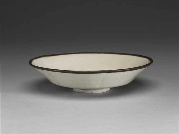 折腰盤,撇口,口作六瓣花式,曲弧不明顯,淺壁,折腰,器裡折腰痕明顯,底寬平微凹下,小矮圈足,外壁於花口下有六道淺棱。全器滿釉色牙白,光素無紋。覆燒成器,口沿無釉,鑲銅釦棱。外底施釉不均,足內大半露胎,呈黃褐色。