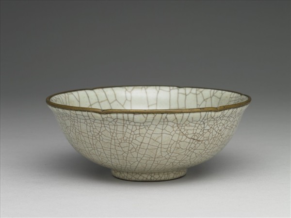 敞口深碗,圓弧形壁,平底矮圈足,口作六瓣花式,曲弧不明顯。全器施哥釉,成灰青色,釉面滿佈深色細密開片紋,口緣鑲銅邊。圈足緣呈黑色。
