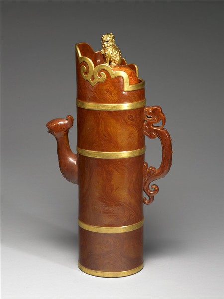 瓷胎,多穆壺造形,僧冠狀器緣勾勒若花瓣式。把手作夔龍形,流口成鳳首式,蓋頂塑獅鈕;圓筒狀器身凸起四道箍稜。全器上褐色仿木紋釉;口緣、箍稜、蓋鈕則仿金屬配件,施金彩。