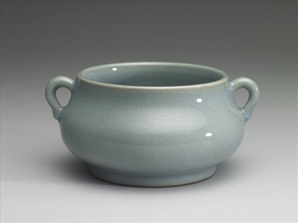 斂口,扁碩腹。平底、矮圈足。頸附半環形耳,胎厚重,全器掛天藍色不透明釉、釉面光亮,有細碎的紋片。足圈露胎處呈淺褐色。底有青花篆款「乾隆年製」。