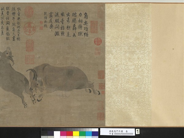 戴嵩(約西元八世紀)最初學畫時,以韓滉為師。畫牛有青出於藍的聲譽,又擅長於農家風景。他的弟弟戴嶧也以畫牛而聞名。 畫兩牛相鬥,一頭牛用角觝觸,另一牛卻旋轉著身子,好像雖敗而欲再迎戰。依「事物紀原」(明高承撰),鬥牛之俗始於秦。此幅畫牛,身驅頗為健壯,大有蠻勁足以力仆萬人之慨。從其畫風觀之,此作或屬明中期以前輾轉流傳的摹本。