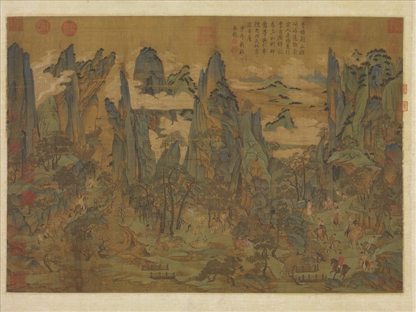 天寶十四年(西元七五五年)安祿山舉兵造反,陷長安,明皇幸蜀避之。畫中著朱衣者即明皇,騎三騣照夜白,出棧道飛仙嶺下,乍見小橋,馬驚不進。筆法精勁工細,青綠設色,絢燦華麗。有學者認為本幅係宋人據舊稿摹繪者。