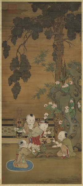 蘇漢臣(約西元十二世紀),河南開封人。歷任北宋徽宗宣和、南宋高宗紹興畫院待詔。工道釋人物,尤擅畫嬰孩。隆興初,畫佛像稱旨,補承信郎。庭院中四童子浴佛為戲,一位手扶誕生佛像台座,一位手持水瓶灌佛,一位手捧花籃,另一位雙手合十跪地禮拜。每位童子神情專注,描繪栩栩如生。全圖設色明麗,筆墨精到。幅上並無作者款印,舊傳為宋蘇漢臣之作。