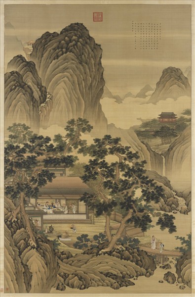 黃應諶,順天人。字敬一,號劍庵。善畫人物、鬼判、嬰孩。於順治十五年(西元一六五八年)入畫院。   此圖筆墨明淨,設色光艷。凡林木、峰巒、屋宇、流泉,無不布置妥帖。人物仍有明院派習氣。