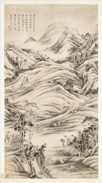 清張若澄畫撤圍待圍合圍罷圍 張若澄,字鏡堅,一字鍊雪,若靄之弟,安徽桐城人,乾隆乙丑(一七四五)進士。善山水,並工花鳥。 清高宗沿聖祖之習,每年七、八月間,率滿蒙王公至木蘭(承德市北之圍場縣)行獵。乾隆壬申(一七五二)高宗有行圍四詠,命張若澄圖繪其事。左題分畫四幅: 撤圍,蓋獵前布圍,分路合驅野獸,以便狩獵。 待圍,撤圍既畢,主獵者待禽獸之驅集。 合圍,兩旗既合,禽獸齊集,射飛逐走,以成狩獵。 罷圍,行獵既畢,豐獲而歸。