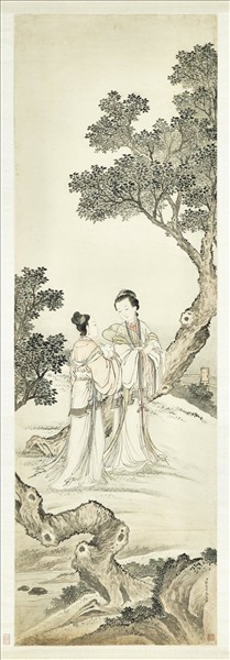 張廷彥(西元一七三五至一七九四年),江蘇揚州人,一作庭彥。乾隆朝供奉內廷。工人物。 圖繪桂樹雙株,幹橫花滿枝。二仕女併立其間,一手執紈扇;一懷抱白兔。容貌詳和,敷色雅澹,衣摺紋路簡明有力。裙擺衣帶飄曳,似薰風輕拂,全局氣氛柔和安逸。 青女,乃天神、青霄玉女,主霜雪。按淮南子天文「至秋三月,青女乃出,以降霜雪。」素娥,即指嫦娥,因月色白,故亦以素稱之。