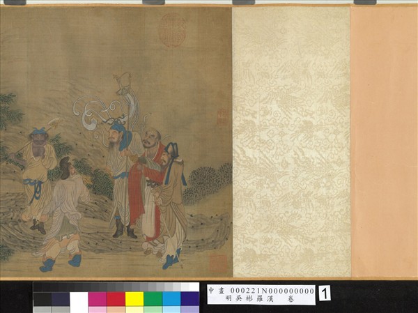 吳彬(活動於西元一五六八至一六二七年),字文仲,福建莆田人,流居金陵(今南京)。能書善畫,畫山水、佛像、人物皆能自立門戶,造形奇異,迥別於前人。   此卷畫十八應真或坐或立,或止或行,形相奇古。全圖筆墨精妍,樹石造型,傅色墨染,具有藍瑛氣息。人物造形以及衣紋描法,已漸形成吳彬特有的素簡樸拙的風韻。款署枝隱頭陀,吳彬在南京時常用此名號。