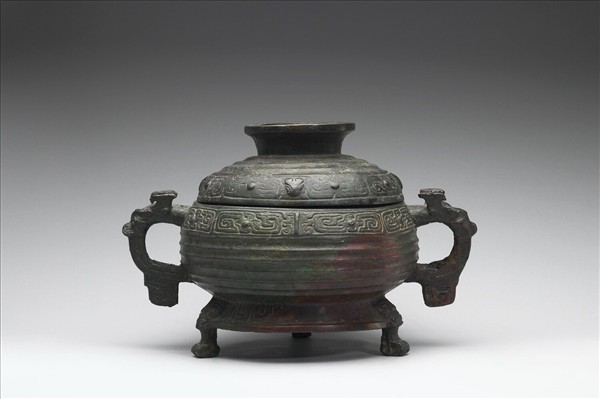 附鈕蓋、圈足鈕、子母口、雙環耳、圓腹、圈足,耳做獸首形,下有附珥,圈足下有三小獸面足。蓋沿與口沿各有一圈有目竊曲紋飾帶,蓋與器腹飾瓦紋,圈足則飾垂鱗紋。