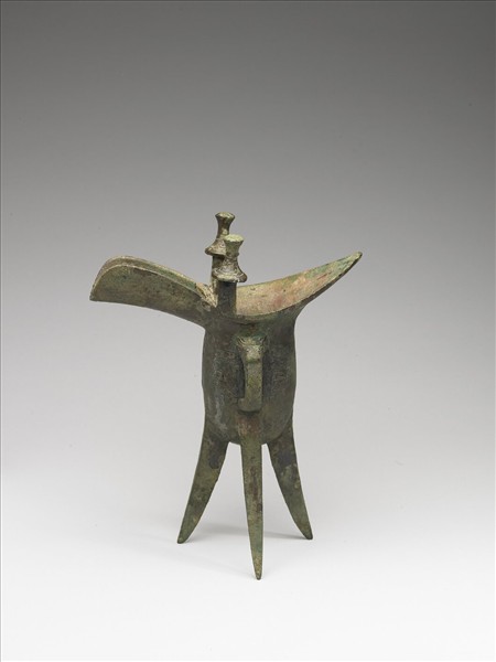 爵,直筒腹、底圜凸、三棱形足、二傘狀柱、獸首鋬。腹飾獸面紋。鋬內及柱上各有銘二字。