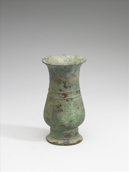 觶,橢圓形、侈口、束頸、鼓腹、圈足微撇。頸、足皆飾弦紋。腹內底部有銘三字。