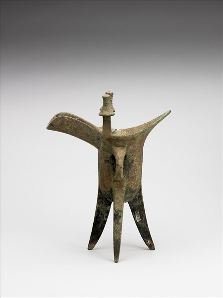 爵,直筒腹、底圜凸、三棱形足、二傘狀柱、環形鋬。腹部紋飾幾為銅鏽所掩。鋬內有銘二字。