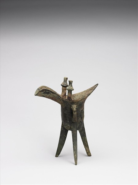 爵,直筒腹、底圜凸、三棱形足、二傘狀柱、獸首鋬。腹飾雲雷紋。鋬內有銘三字:「〔鼎〕。父乙。 」。