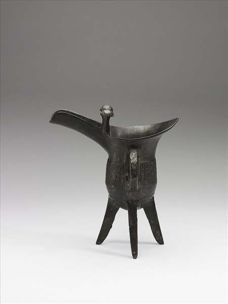 長流,尖尾,口沿有二柱,獸首鋬,深腹下碩,圓底,三個外撇的板形尖足。除了腹外壁的飾帶外,其餘光素無紋。腹外飾帶有暗示雙眼的圓凸起,配合滿飾的減地雲雷紋為地,成為眉目清晰的獸面紋。銘文位於鋬後。