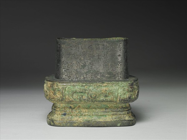 方壺器蓋,蓋沿飾竊曲紋,蓋頂飾凸目竊曲紋及夔龍紋。 頸壁上環繞銘文二十五行一百字(重文二字)。