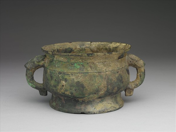 底微下拱,底外圈足以內填滿黃土,口緣下弦紋二道,底外有陽線格紋,雙耳上端飾獸首,有珥。器內底有銘文二行十字。