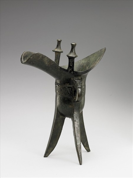 爵,直筒腹、底圜凸、三棱形足、二傘狀柱、獸首鋬。腹飾竊曲紋。柱上有銘三字。