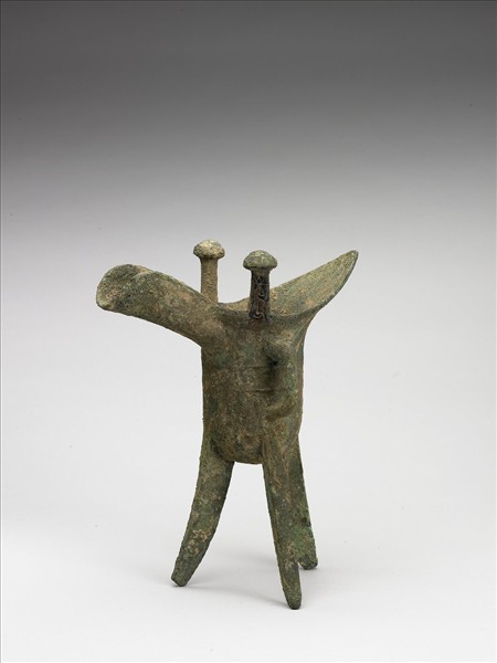 爵,直筒腹、底圜凸、三棱形足、二菌狀柱、環形鋬。腹飾弦紋。柱上有銘三字。