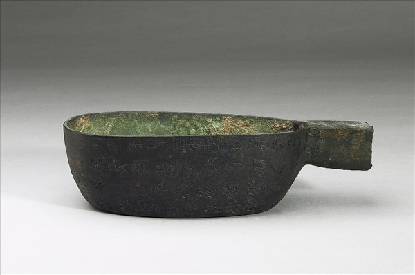 橢圓形,有鋬柄。外壁有銘四十字:「廿六年皇帝盡并兼天下諸侯,黔首大安,立號為皇帝,乃詔丞相狀、綰,法度量則,不壹,歉疑者,皆明壹之。」記秦王政在位的第二十六年(西元前221),統一了各國諸侯,百姓得到安寧,建立尊號為「皇帝」。於是詔示丞相隗狀與王綰制定標準的度量,使不統一、有疑問的、都能明確劃一。秦始皇廢封建,立郡縣,集權中央是奠定在制度統一的基礎上。秦始皇「一法度、衡石丈尺、車同軌、書同文」的措施,見證於秦始皇頒布的統一度量衡的詔書,鑄刻在大批製作的度量衡標準器上,秦量上即載此詔。《史記》記載秦始皇的丞相隗林,參之秦量銘,方知「林」為「狀」之誤。金文考史,本器銘是一個很好的例證。