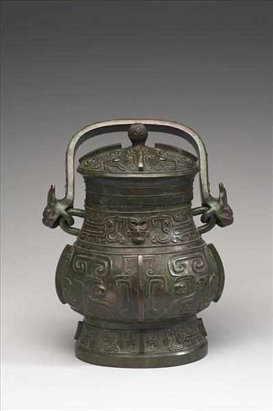帶蓋,器作子母口,長頸,鼓腹略垂,圈足。U形提梁兩端作浮雕獸首,提梁與器頸之間以環耳相接。全器無地紋,蓋面和器腹中段作獸面紋,頸間和圈足飾夔鳳紋。器蓋對銘二字。本器為乾隆三十四年(1769)頒賜國子監的「周笵十器」之一,名之「周內言卣」。