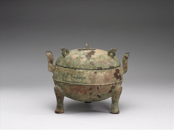 鼎,帶蓋,蓋上有三環耳,子母口、立耳、圓腹、蹄足。器腹中央則有凸弦紋一道。兩耳與器底內有刻銘。