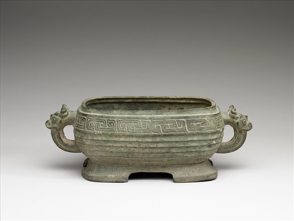 器作長方形,轉角處圓,兩獸耳,口緣及足均飾竊曲紋,腹飾瓦紋,失蓋。器內底有銘文三行十五字。