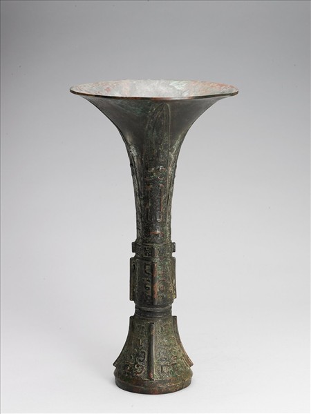 觚口極度外張,直筒腹,圈足起臺。頸部飾蕉葉紋,內填解體獸面紋,下頸處則有一小周渦紋與四瓣花紋相間紋飾帶。腹部、圈足飾解體獸面紋。下頸處、腹部、圈足皆有四條扉稜。此器仿自商晚期觚的造型,但渦紋、四瓣花紋、地紋的雲雷紋等細節多有訛舛。器表紅、綠作鏽,局部紋飾覆蓋瘤狀物彷彿堆疊的鏽層,以上特徵均為晚期仿古器常見的作舊方式。本件器物是乾隆三十四年(1769)頒賜國子監的「周笵十器」之一,名之為「周雷紋觚」。