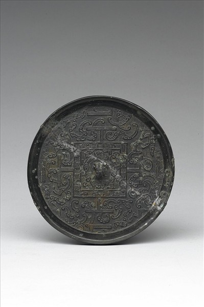 圓鏡,圓鈕、鳥紋鈕座。內區銘文帶十六字,外區飾博局紋與星雲紋。