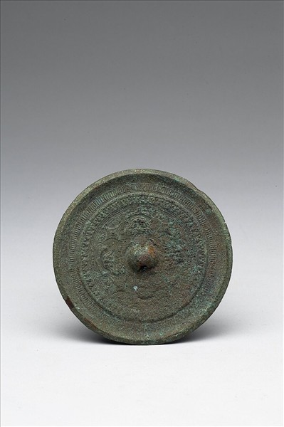 圓鏡,半球鈕,圓鈕座。背素邊,外輪飾以直紋,內區飾四鋪首紋。